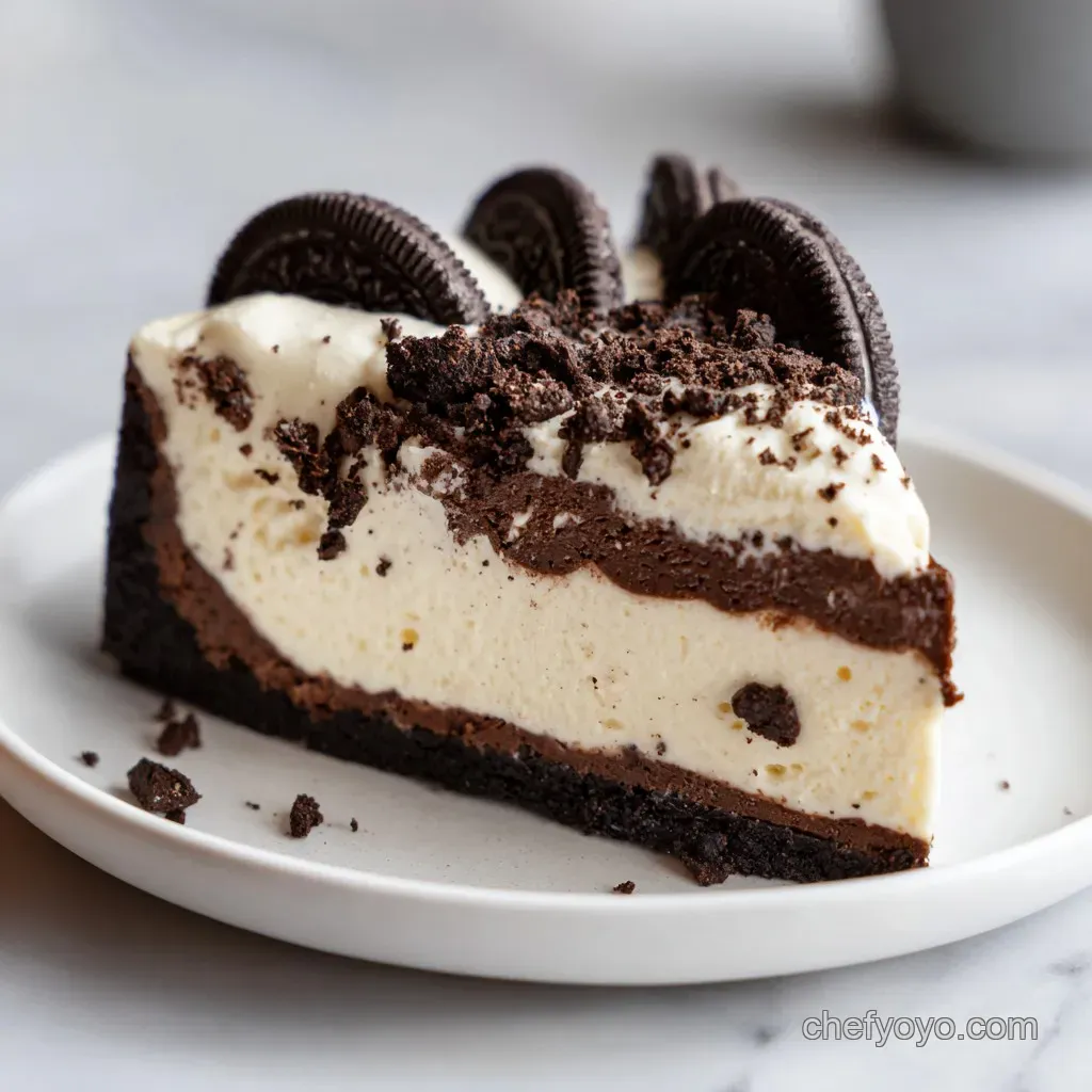 Instead of just crumbling Oreos on top, take a few whole cookies and press them vertically into the top of the filling around the edges. This creates a crown effect. You can also add a few fresh raspberries or a drizzle of melted dark chocolate to break up the monochrome look.