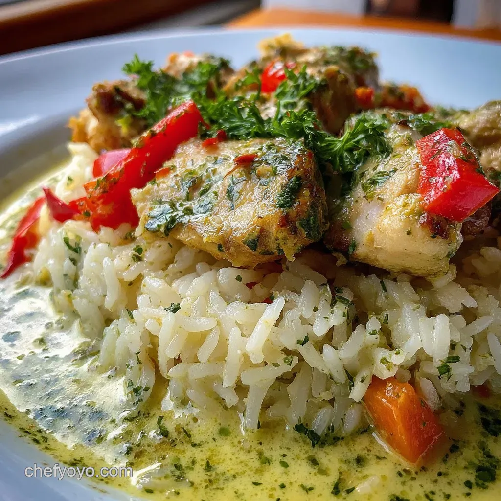 The contrast between the deep emerald rice, the golden brown chicken, and the creamy pale green sauce is absolutely stunning.